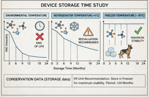 It is important to know how long the device can be stored without losing its effectiveness, and under what conditions. An appropriate shelf life ensures that, even after a period of storage, the device will retain its properties and provide a scent trail representative of the actual substance when used for training. This is key to ensuring the device’s long-term reliability. For example, if we look at a study such as the one shown in Figure 6, we will conclude that storage in a freezer (-18°C) allows for optimal preservation of the baits, which remain stable for up to 24 months.