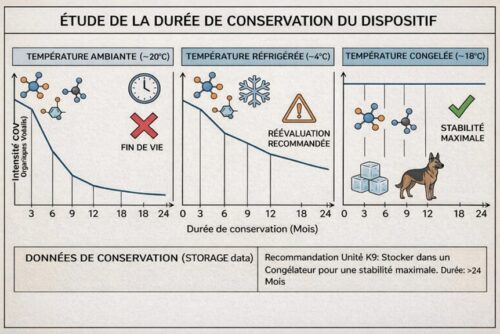 Il est important de savoir combien de temps le dispositif peut être stocké sans perdre de son efficacité, et dans quelles conditions. Une durée de conservation adéquate garantit que, même après une période de stockage, le dispositif conservera ses propriétés et diffusera un cône olfactif représentatif de la substance réelle lorsqu’il sera utilisé pour l’entraînement. C’est essentiel pour assurer la fiabilité du dispositif à long terme. Par exemple, si l’on examine une étude telle que celle représentée dans l’illustration 6, on peut en conclure qu’un stockage au congélateur (-18 °C) permet une conservation optimale des appâts, qui restent stables jusqu’à 24 mois.